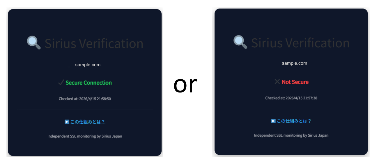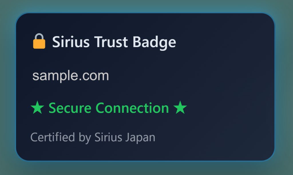 Sirius Trust Badge は、ウェブサイトの HTTPS(SSL)接続が有効であることを、第三者の立場から確認し、視覚的に表示する無料のバッジサービスです。